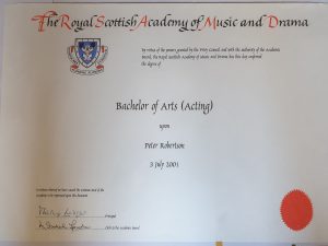 Peter began acting in 1997 when he was accepted to Reid Kerr college, (West of Scotland College) on the NC theatre arts course. Peter auditioned for the Royal Scottish Academy of Music and Drama acting course and was accepted. Here he was fully trained by some of the best in the business in the world. While Peter was at the RSAMD he was awarded the prestigious award The MacBrydon (DDA’97) Prize, which is for movement throughout the course. After graduating from the RSAMD Peter participated in further acting training at Strathclyde University as well as The Actors Cut, which is a course jointly run by BBC, Equity and Gregg Byatt and Andrew Byatt.
